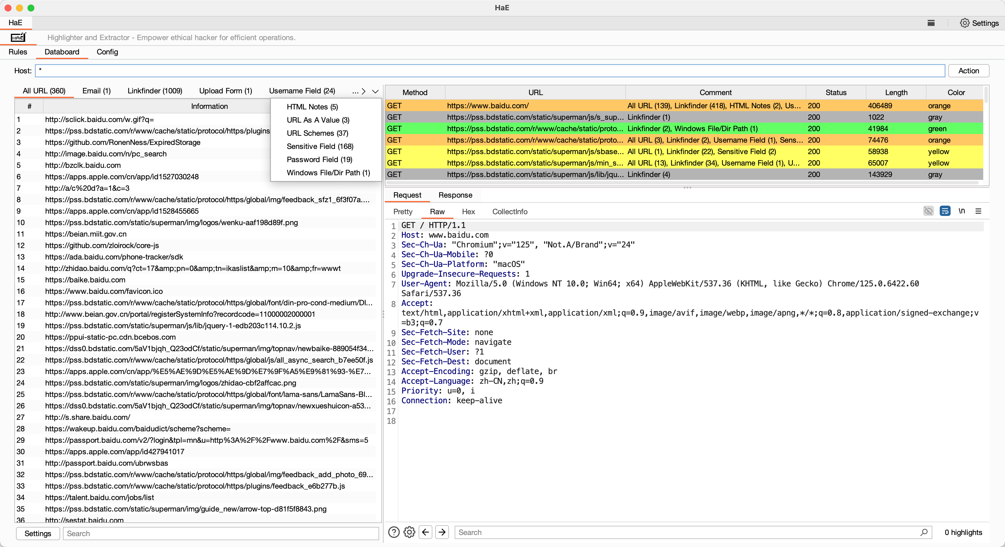 **HaE**是一款网络安全(数据安全)领域下的辅助型框架式项目,旨在实现对HTTP消息(包含WebSocket)的高亮标记和信息提取。本项目通过自定义正则表达式匹配响应报文或请求报文,并对匹配成功的报文进行标记和提取。
