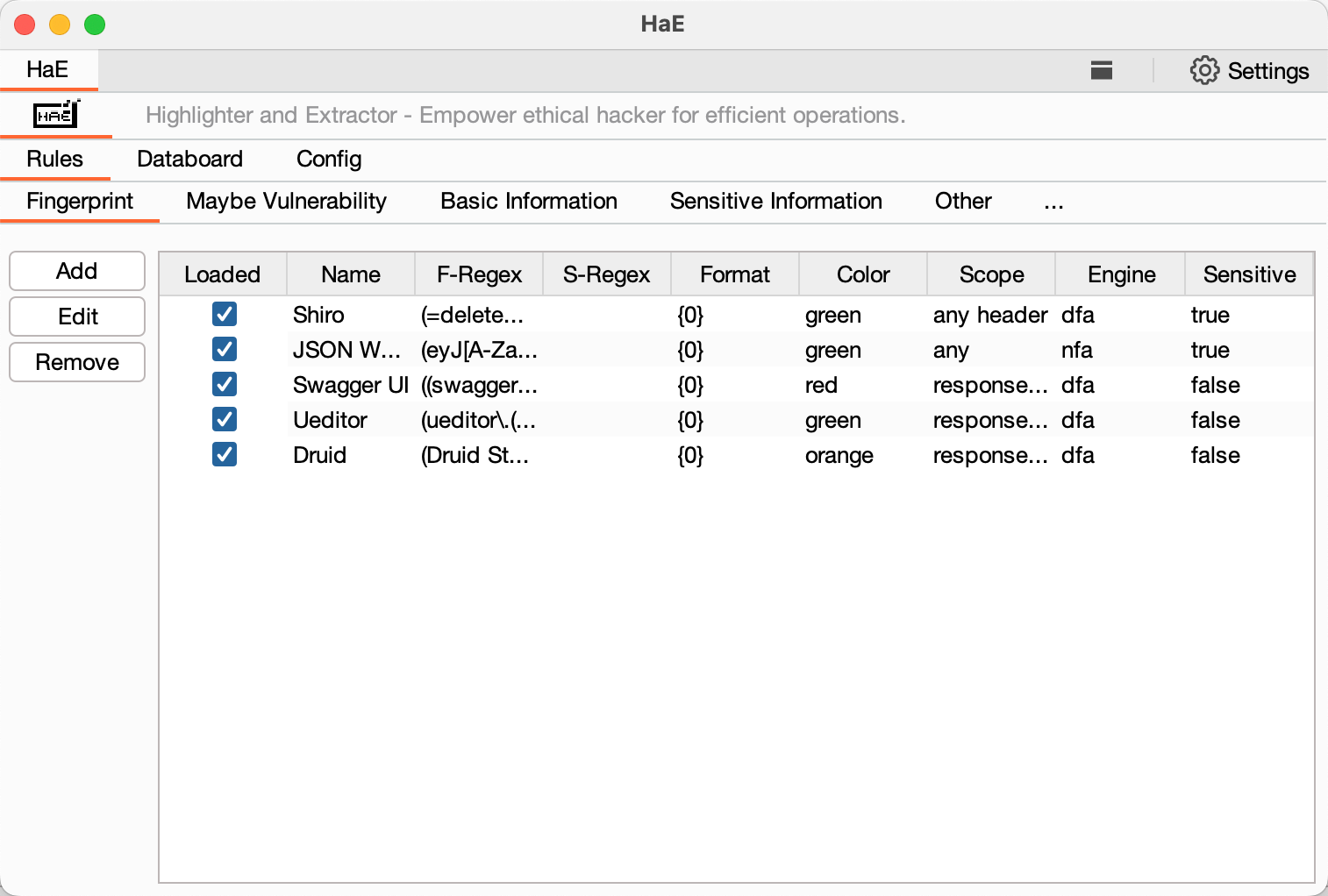 **HaE**是一款网络安全(数据安全)领域下的辅助型框架式项目,旨在实现对HTTP消息(包含WebSocket)的高亮标记和信息提取。本项目通过自定义正则表达式匹配响应报文或请求报文,并对匹配成功的报文进行标记和提取。