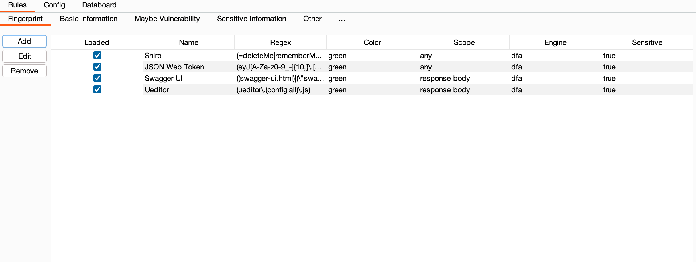 **注**: 要想灵活的使用`HaE`,你需要掌握正则表达式阅读、编写、修改能力;由于`Java`正则表达式的库并没有`Python`的优雅或方便,所以HaE要求使用者必须用`()`将所需提取的表达式内容包含;例如你要匹配一个**Shiro应用**的响应报文,正常匹配规则为`rememberMe=delete`,如果你要提取这段内容的话就需要变成`(rememberMe=delete)`。
